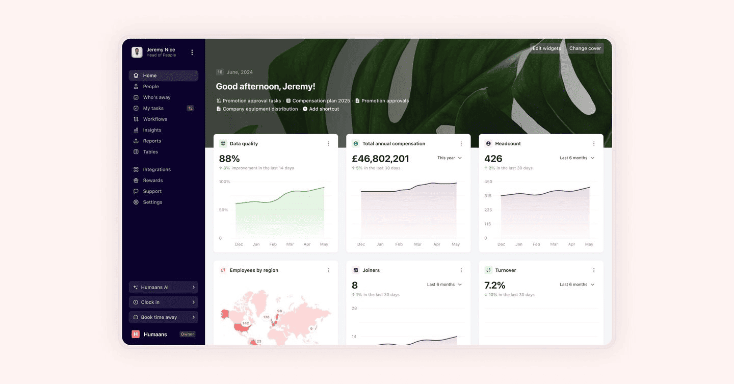 From day one, Humaans aims to simplify employee onboarding, time-off tracking, document handling, and organizational changes through intuitive workflows and integrated tools. With one centralized dashboard, users can quickly view employee statuses, roles, team structures, and more. This enables businesses to make informed decisions using real-time people analytics.