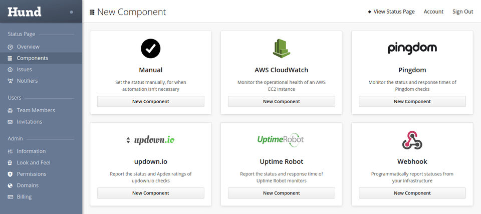 Hund is the Hosted Status Page Software used for the below functionalities.