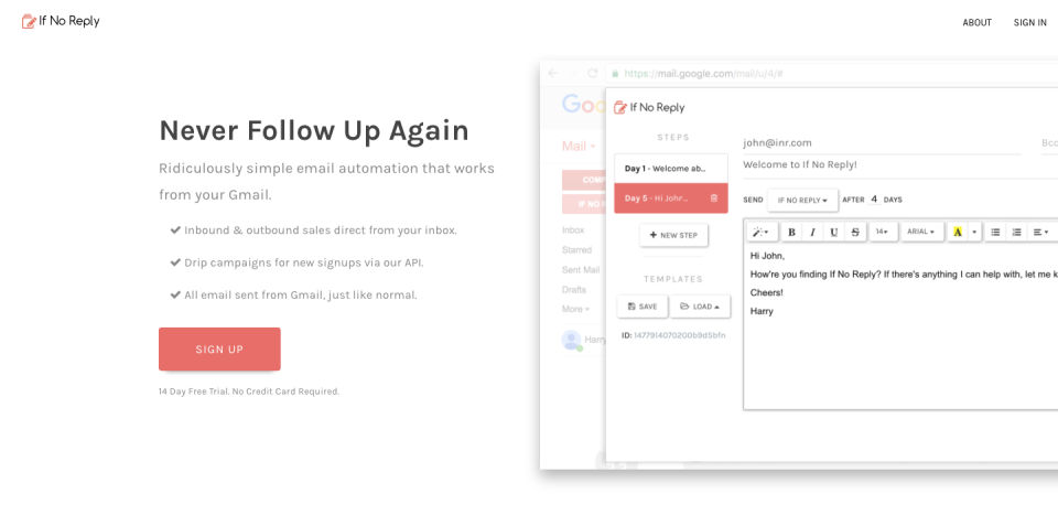 If no reply offers easy to use follow up mails. They can be triggered on several events. For instance when a recipient did not reply to your mail after 2 days If No Reply can trigger a mail you pre-defined for exactly this case. It is well integrated into gmail.