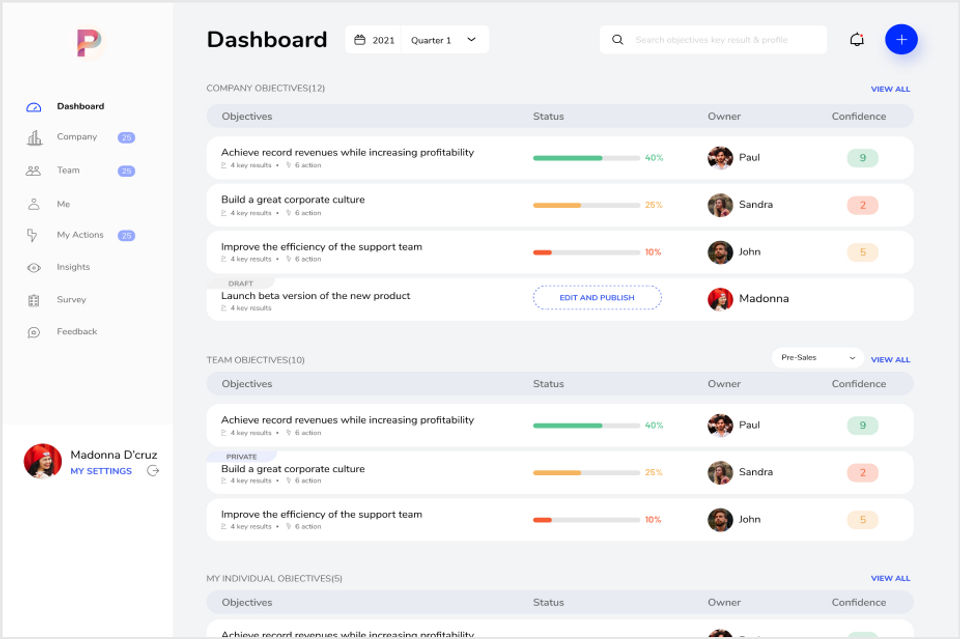 JOP differentiates itself by combining OKR management with integrated performance reviews and real-time feedback in a single platform. Its intuitive user interface allows for quick adoption, even for teams new to OKRs. The system’s flexibility supports multiple goal-setting frameworks, while its powerful analytics offer actionable insights. Unlike traditional tools, JOP emphasizes continuous improvement and employee engagement through check-ins, recognitions, and team collaborations. It also offers seamless integrations with commonly used tools like Slack and Microsoft Teams. With a focus on transparency, alignment, and performance, JOP creates a work culture where every employee understands their impact and is empowered to grow.