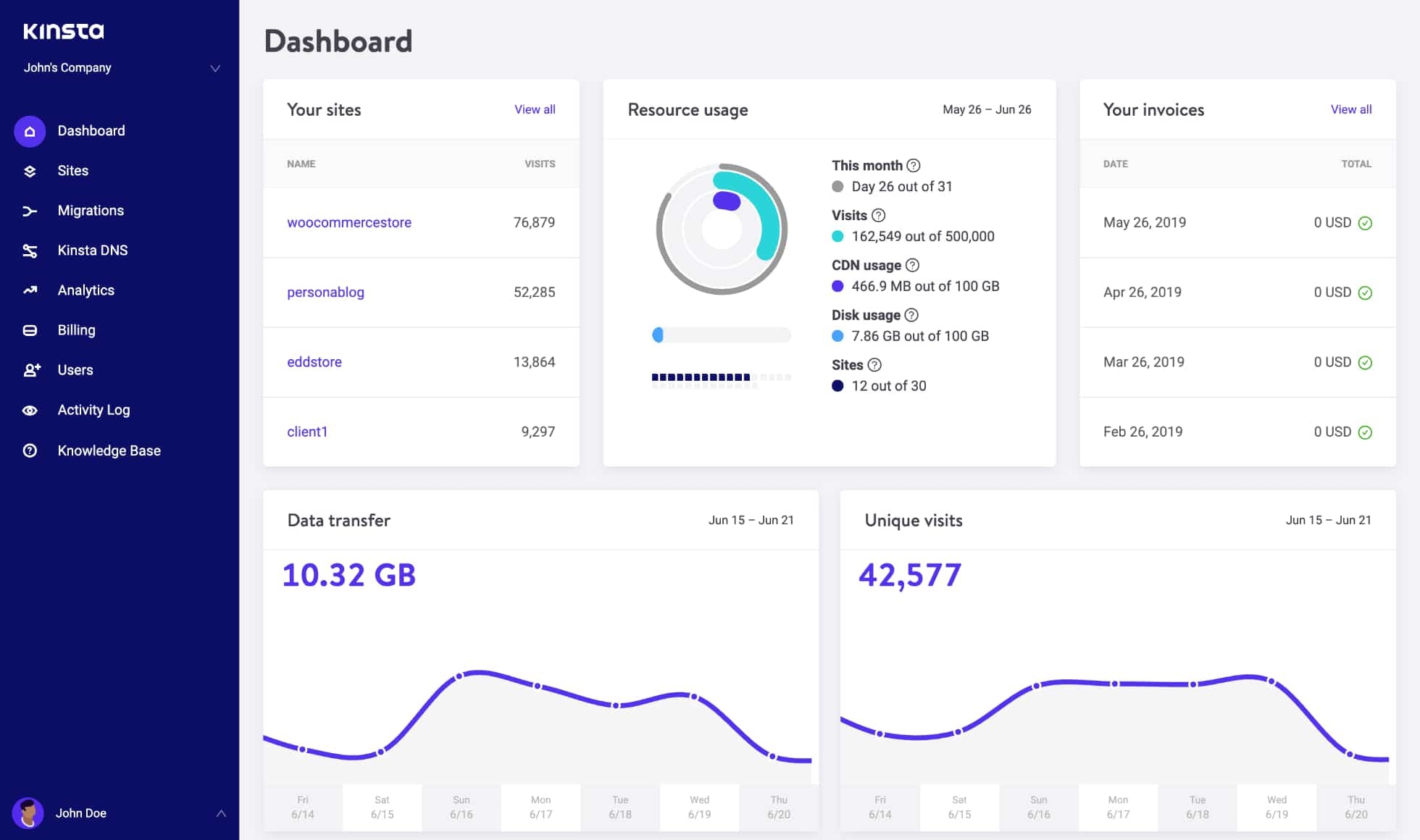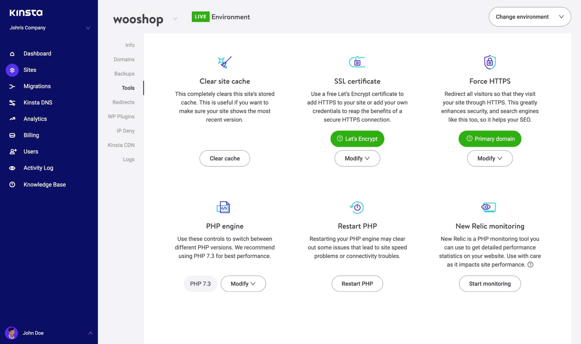 - Manage performance, backups, and security from the MyKinsta dashboard