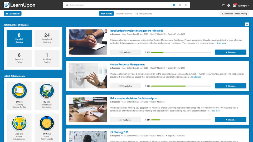 At the beginning of working with in the system we did not like there was not much of a hierarchy option for the courses. This we have solved with Learning Paths, which our members like more than just having a list of 32 course they can choose from.