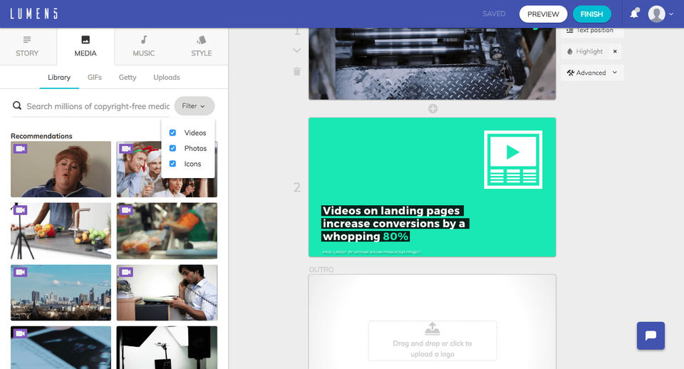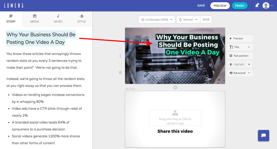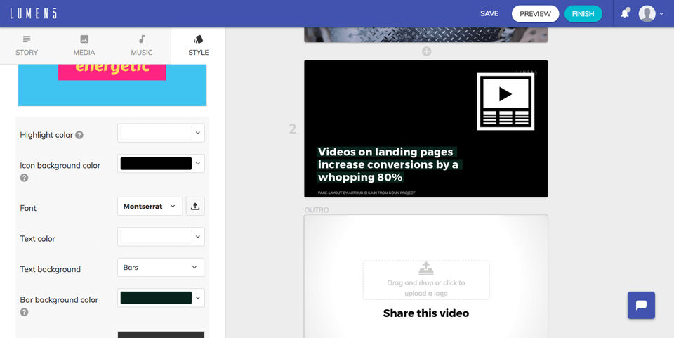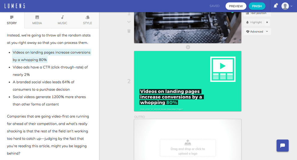 Lumen5 is too incredible and easy to use, has many functions to achieve incredible finishes incluse in the free version, and is perfect for creating marketing content. You can grab any text, copy it and paste it into the tool and create high quality videos, even in addition to the gallery that Lumen5 already has, you can upload your own images and videos to use in different scenes.