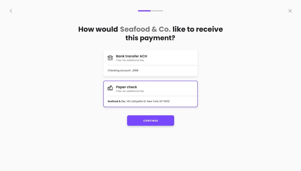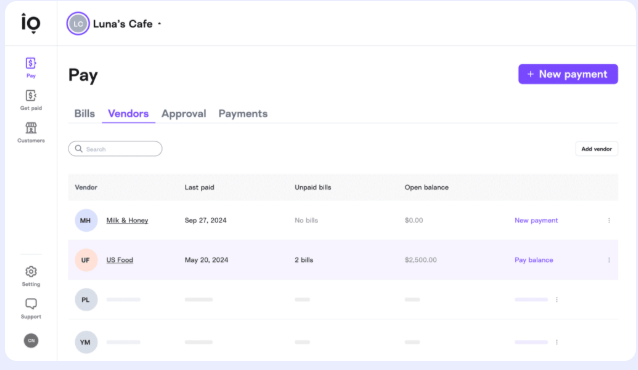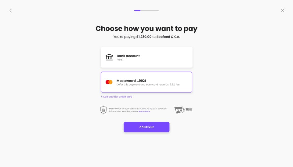 Flexible Payment Options: Pay via ACH (free), credit/debit card (2.9% fee), or check; vendors don’t need a Melio account.