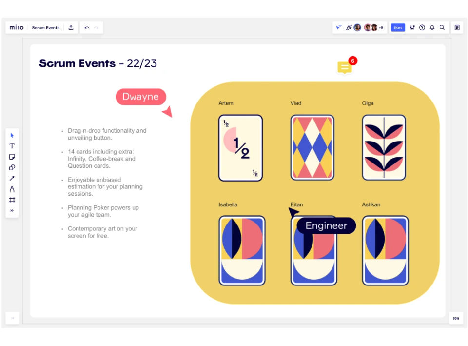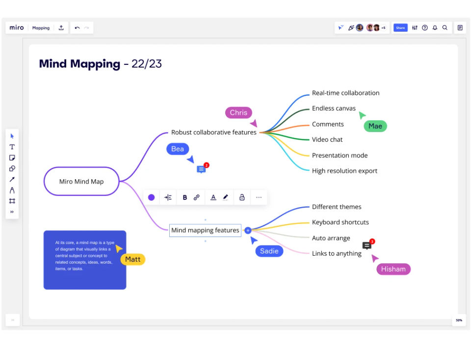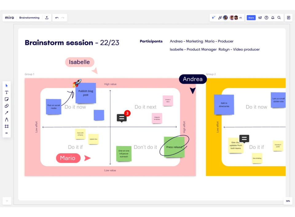 To use Miro Associates, sign up and create a new board. Choose from templates or start with a blank canvas. Invite team members to collaborate, add sticky notes, shapes, text, or images, and organize your ideas visually. Use tools like voting or commenting to gather input and finalize plans.Features of Miro