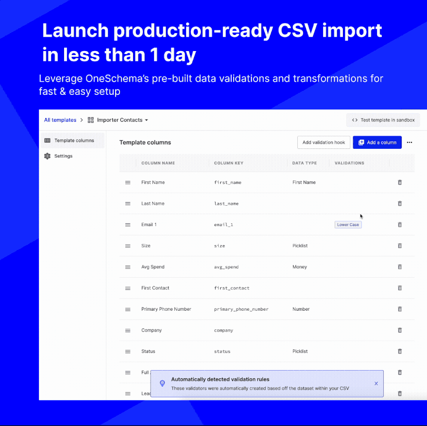 The product is so flexible. Every time we needed a new feature or customization, the implementation team at OneSchema had a recommended solution. For example, we have 15 different data templates we use with customers in different countries—OneSchema lets us generate them with code instead of having to hand-create templates for each. Our engineering team was really happy about that.