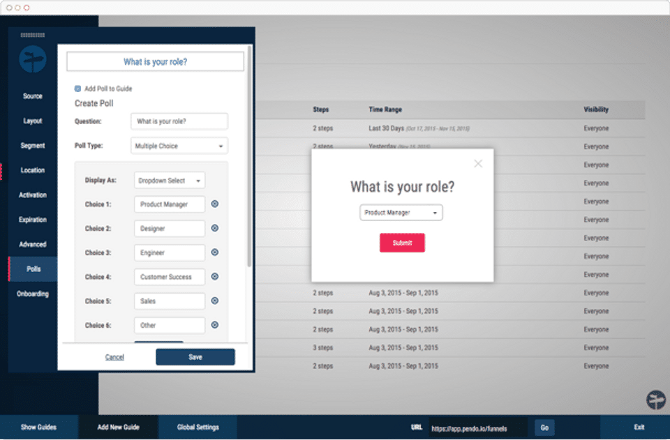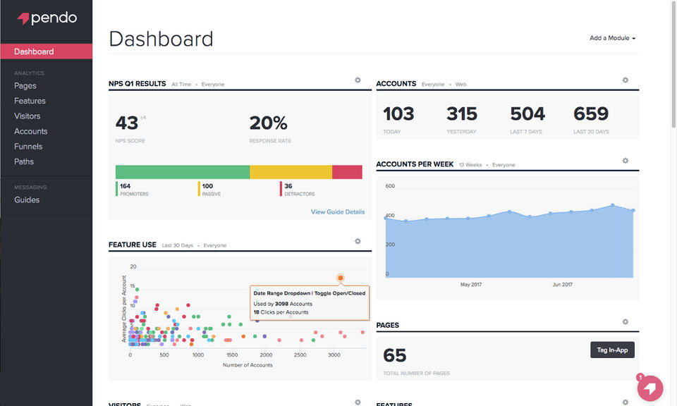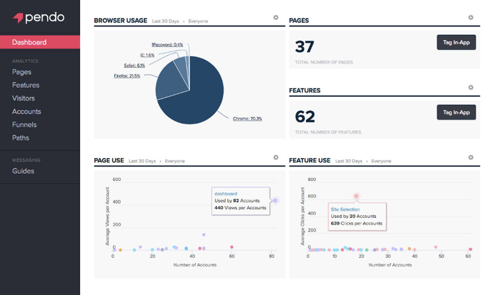 Pendo does a great job telling us where are users are going and what features they are using. It also tells us device and browser usage and gives us a lot of segmentation capabilities.