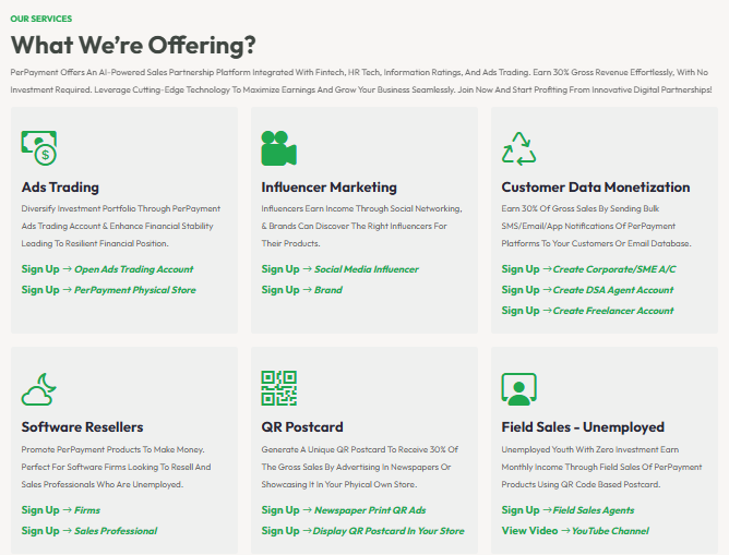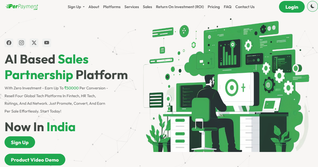 PerPayment is a flexible platform built around the concept of AI‑driven sales partnerships. It empowers individuals and businesses to monetize digital offerings across HR Tech, Fintech, Ratings, and AdTech domains. Rather than requiring upfront investment or technical know-how, this plug‑and‑play system equips partners with marketing-ready assets and transparent earning models to start earning immediately.
