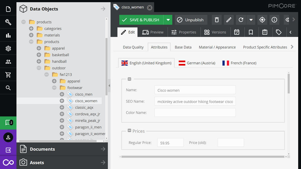 For any organization with a large product base, storing and managing the enormous amount of product information is challenging. Pimcore’s PIM platform enables easy organization, aggregation, classification, and translation of product information – all in a single location. Because of the consolidated product suite, the data can be easily delivered to all output channels.
