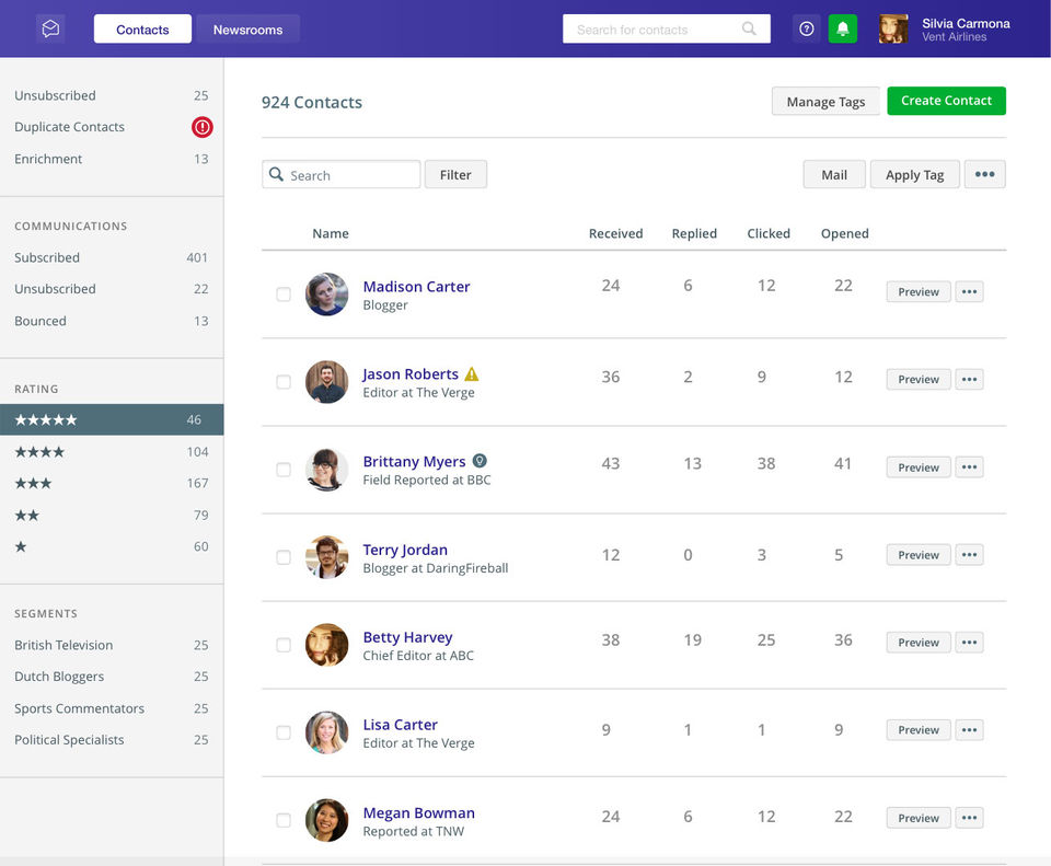 The possibility to upload content like video or images, without sending heavy emails. You can Send and track multimedia press releases. Manage your media and blogger relations in a CRM for PR and Publish to a dedicated newsroom