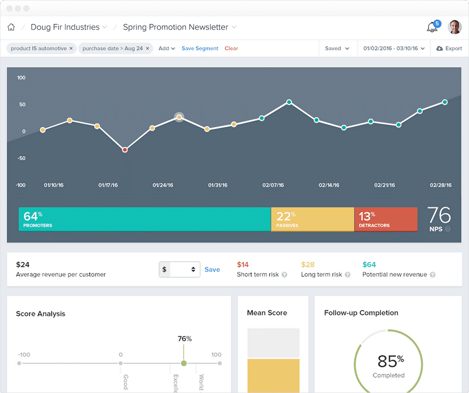 Dashboard. Responsiveness of the team. Customizable inputs and filterability. The price when on a small scale is fair. Unlimited users can access the account. Actually having the NPS data is great.