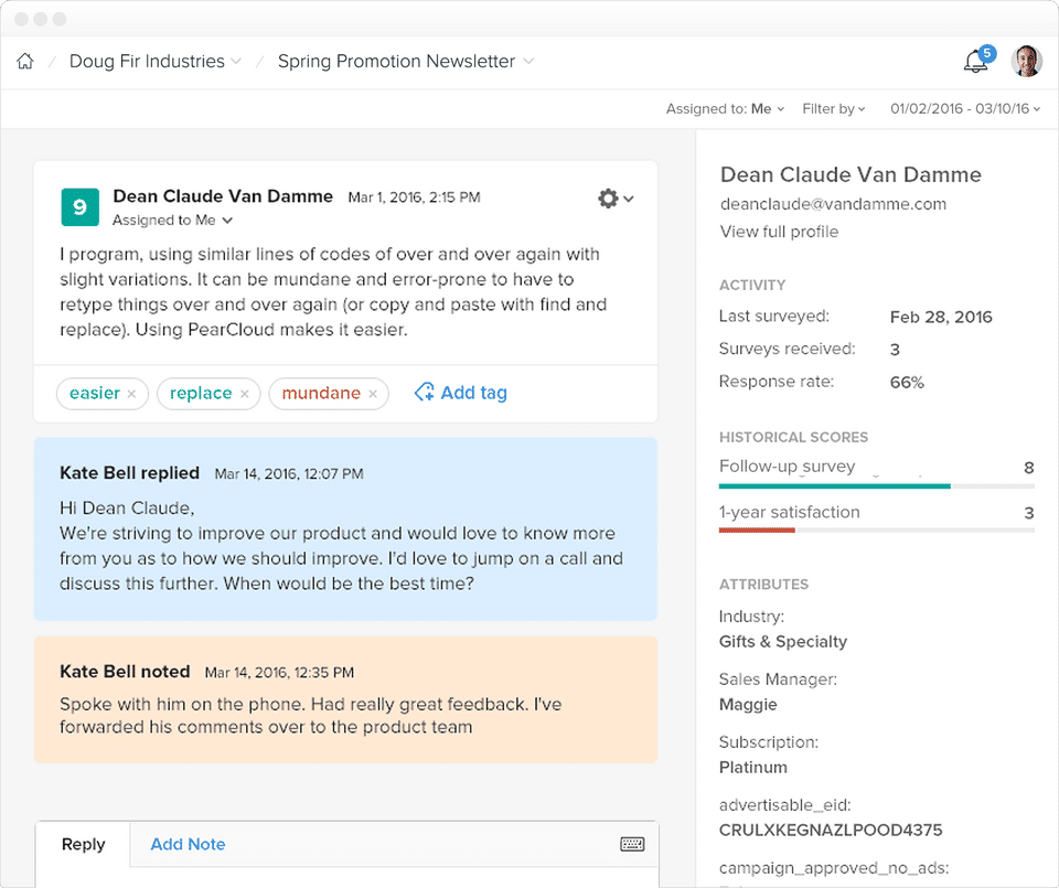 Weekly email report. CSV exports cannot be bound by time, so I have to filter after exporting. Custom dashboards should be available. Pricing/ send should be cheaper as we increase volume, was told this wasn't an option. You should have automatic tagging. Make org recommendations based off the feedback.