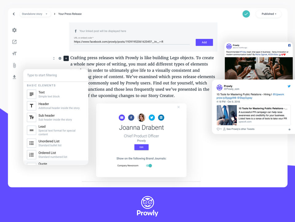 I love that Prowly integrates all aspects of PR into one handy interface. The ability to create a brand image and convert that to relevant campaigns is so convenient. I also love that their are so many videos and tutuorials to guide me along the way.
