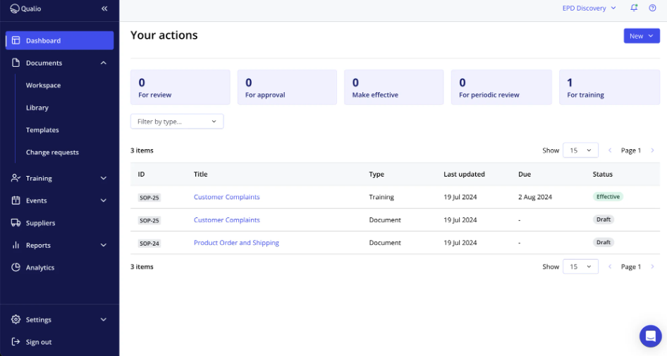 Qualio is the Quality Management Software used for the below functionalities.