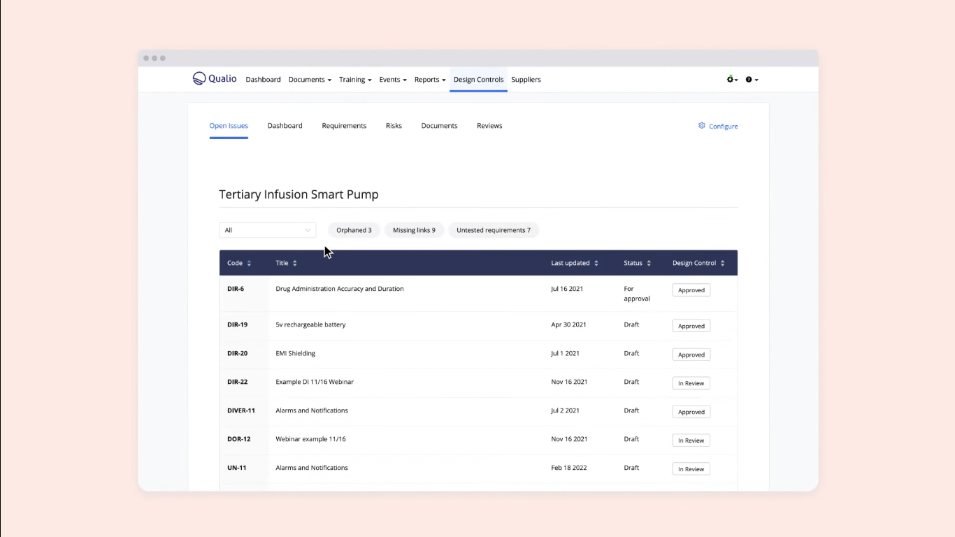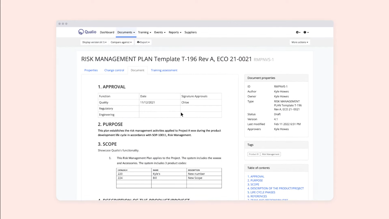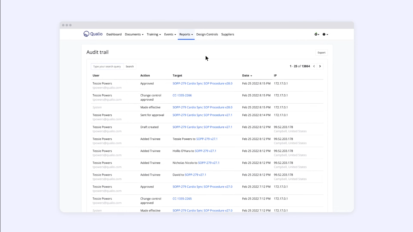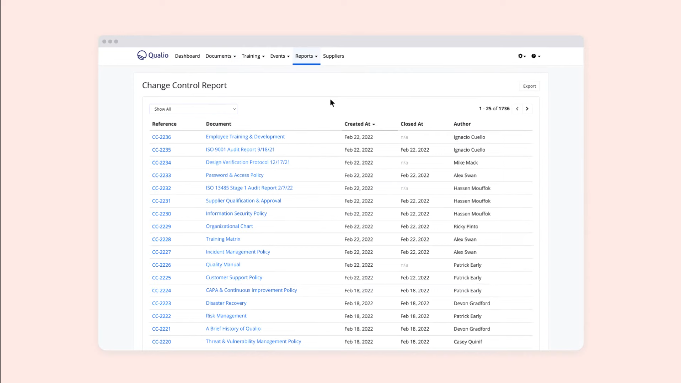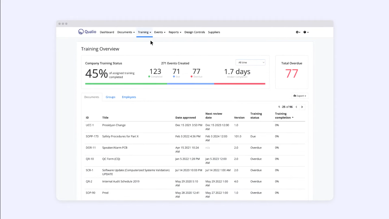 Qualio seamlessly connects quality processes such as document control, training tracking, CAPA, non-conformance handling, audit management, supplier oversight, and design control. Its change control module allows users to log and trace every modification across documents, processes, and systems, while its training module auto-assigns required training based on document changes or employee roles.