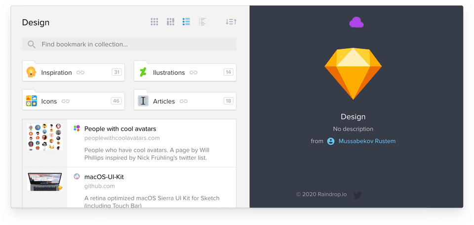 Raindrop.io is software that reviews your browser's bookmark system. By adding a new system to customize the way your bookmarks are organized, it changes the way you save and organize your bookmarks. Raindrop automatically suggests certain bookmark tags based on what you're bookmarking about. Then you can come back and find those tags to find your old bookmarks easily. You can use Raindrop to save anything you find online, whether it's a website article, picture, video, or screenshot. Raindrop also introduces a new collection system and organizes your bookmarks into categories you can choose from.