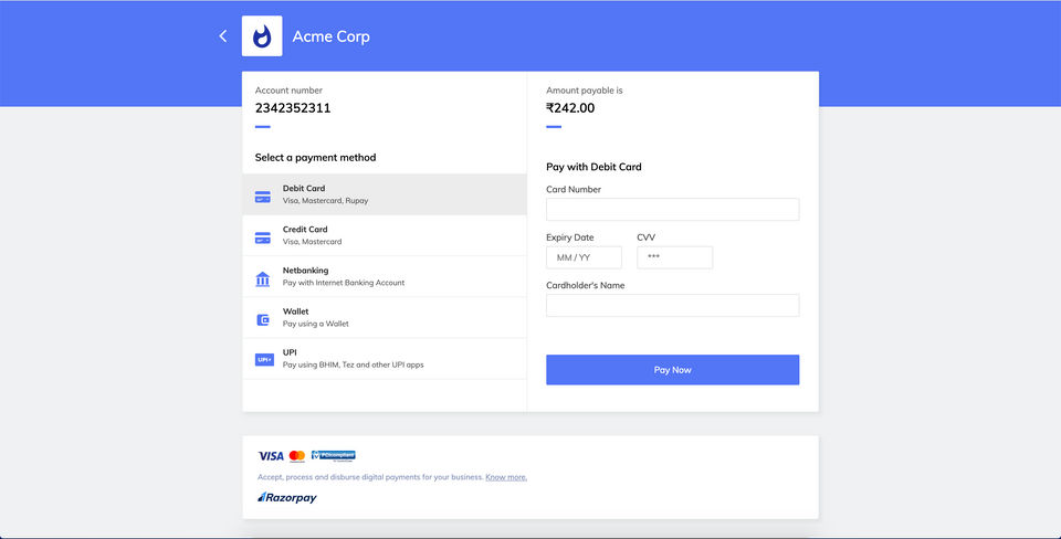 What I like the best about Razorpay is the the Payment Method that it provides, along with security, & not only that, you can pay using any method that you want, whether it be Credit Card, Debit Card, or UPI.