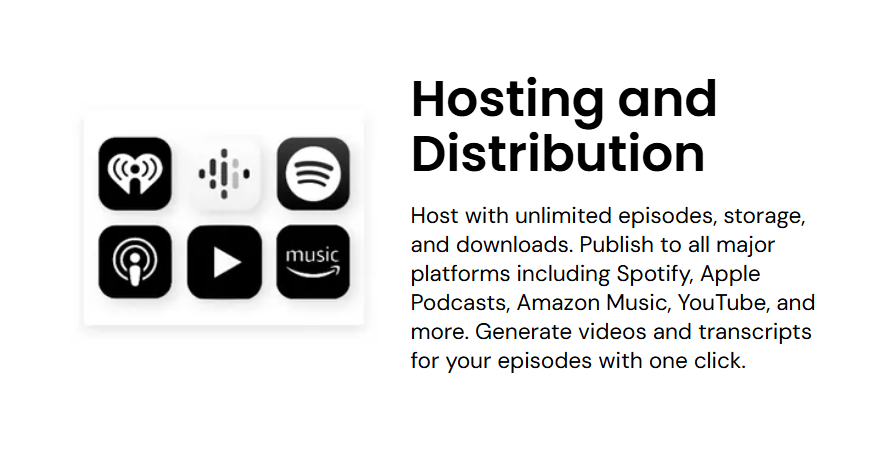 Unlimited Hosting: No caps on storage, downloads, or number of episodes.