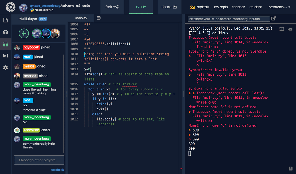 Easy way to interview applicants and look at live code, interactive environment, great way to share code as well