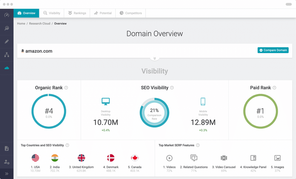 Perfect for users whose approach to analyzing and monitoring search data is focused on a small group of high-impact keywords. Highly applicable for near real-time ranking monitoring. Data collected by SearchMetrics is robust which entails cost but very useful for enterprise-level analysis and organic search project monitoring.