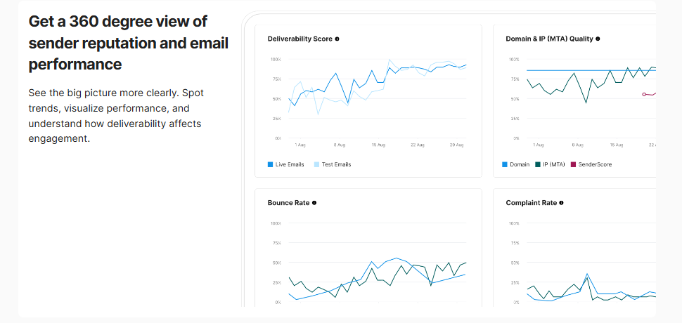 Reputation Dashboard – Centralized view of bounces, blacklists, complaints, and engagement metrics.