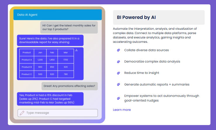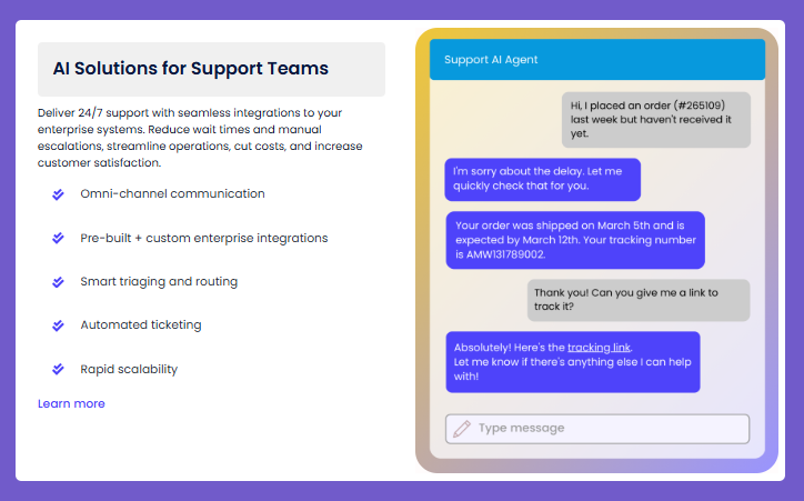 Enterprise AI agents tailored for support, data, HR, and custom workflows.