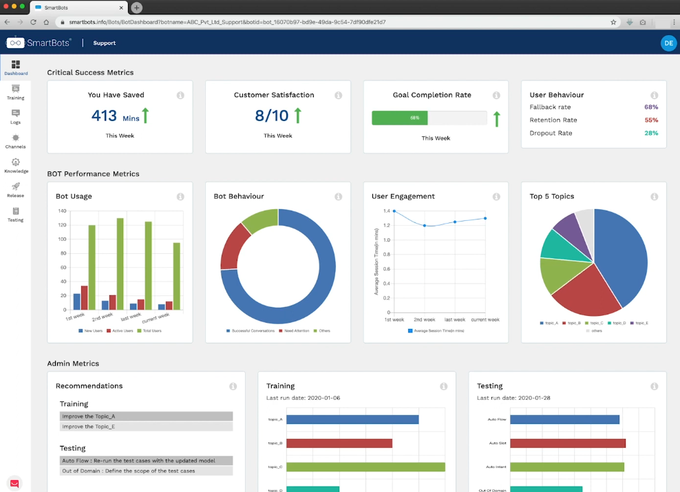 Beyond deployment, SmartBots.ai offers comprehensive monitoring and analytics. Enterprises can track agent activity, view interaction logs, measure performance, and improve workflows through actionable insights. It also provides pre-built templates for rapid setup, enabling quick adoption across business domains.