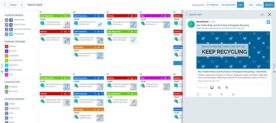 We love the ability to set-up an intricate automated posting schedule. We have content that falls into 7 or 8 different categories. We have 10 different social accounts spread across 3 different brands. So we created a schedule where different types of content are posted across different profiles. Then we created 100 different evergreen posts, turned on Smarter Queue and then let it handle the rest.