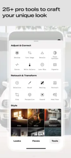 Tools & Filters: 29+ editing tools including Healing, Brush, Structure, HDR, Perspective, Grainy Film, Noir, and more.
