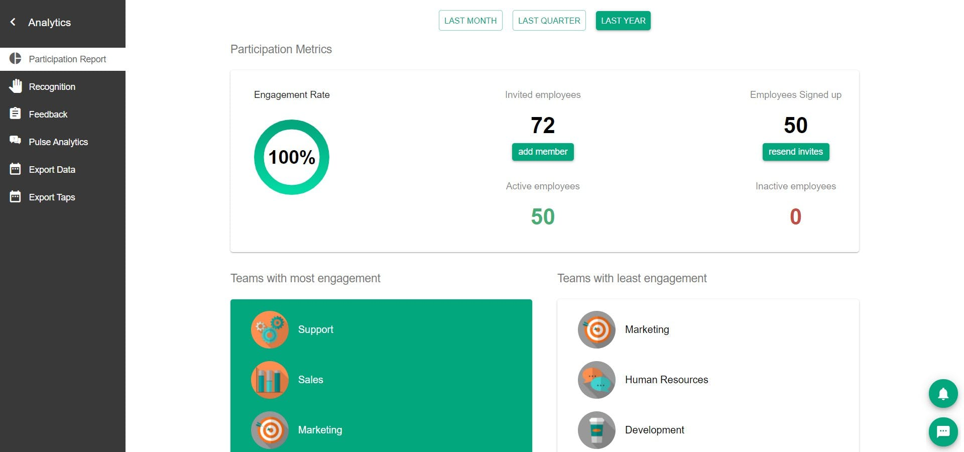 Analytics Dashboard: Offers real-time insights into engagement and team morale.