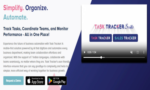 Experience the future of business automation with Task Tracker! A mobile-first solution powered by AI that digitizes and automates every business department, making team collaboration effortless and organized. With the support of 7 Indian languages, collaborate with teams seamlessly, no matter where they are. Task Tracker's user-friendly interface ensures that you can say goodbye to complexity and hello to a simpler, more efficient way of working together for business growth.