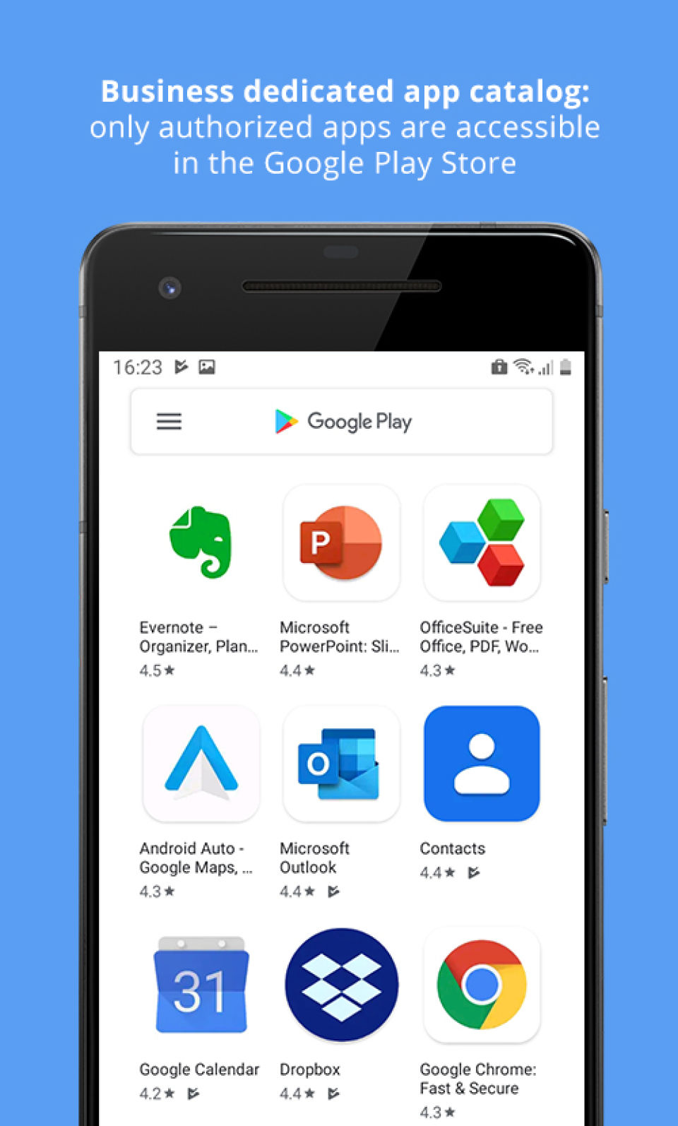 - web and private apps (in house apk) Deploy sideload applications Remote install / uninstall App updates management Permissions management Ap