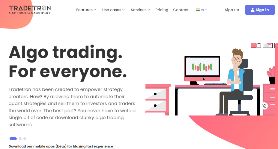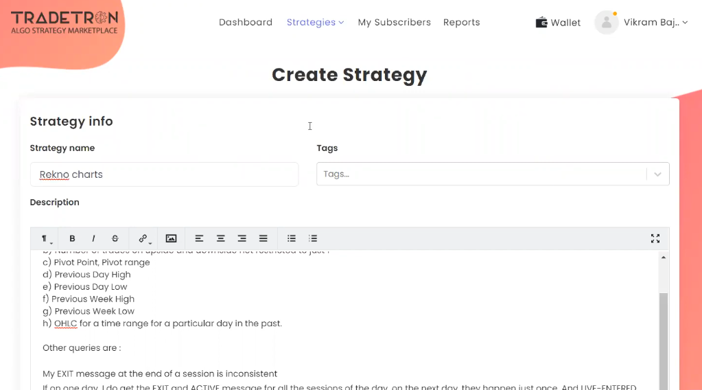 Tradetron is a powerful no-code algo trading platform that allows traders, investors, and financial advisors to automate their trading strategies using a visual rule-based system. The core functionality revolves around a drag-and-drop interface that eliminates the need for programming. Users can set entry and exit conditions, apply technical indicators, use custom variables, and define execution logic—all within an intuitive UI.