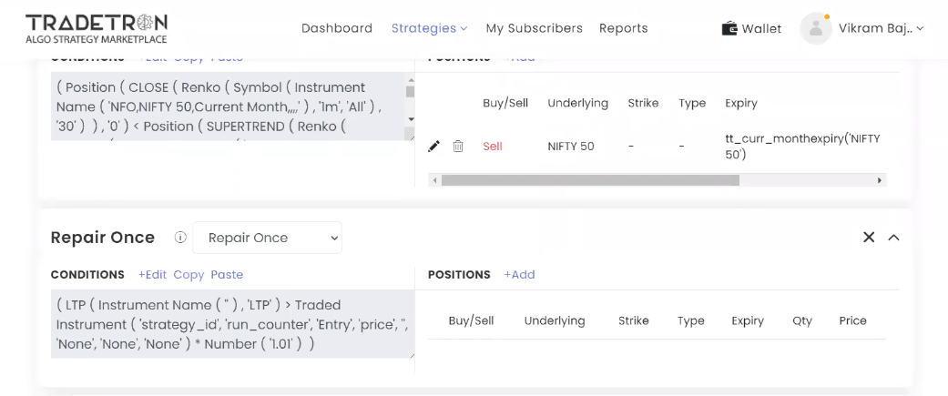 Each strategy is composed of multiple “sets,” which operate as independent blocks of logic. These sets can have their own entry, repair, and exit rules, allowing traders to create sophisticated trading systems under one strategy. Users can fine-tune each leg of the trade with customized quantities, strike prices, and order types, including market, limit, and SL orders.