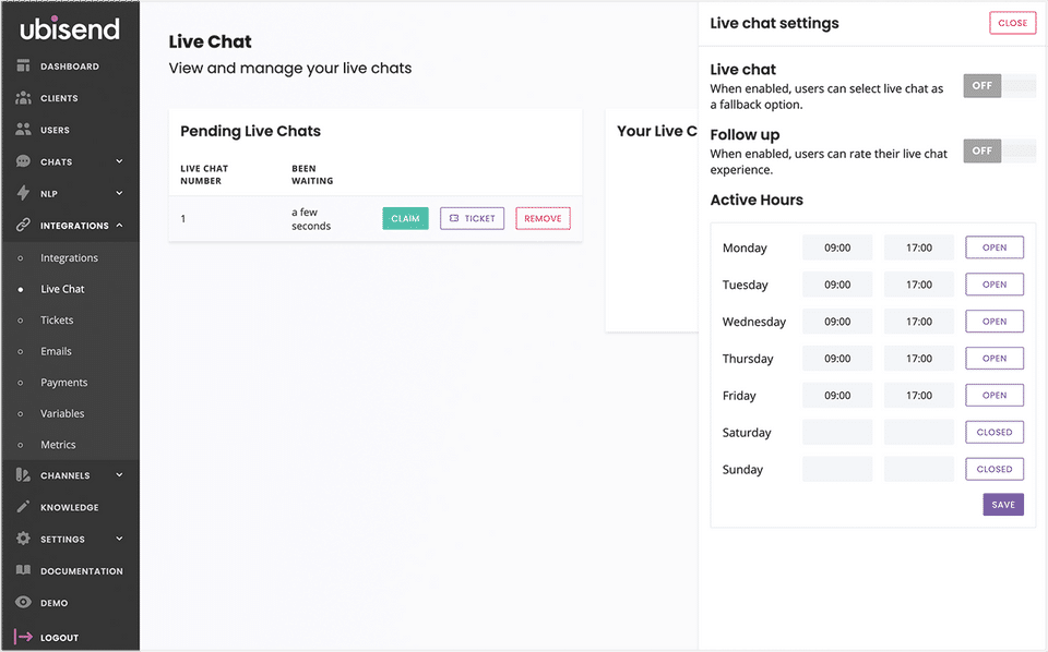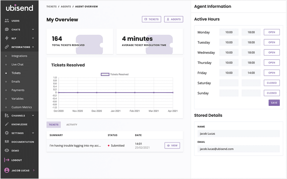ubisend provides Phone,Business Hours,Online (Ticket) support.