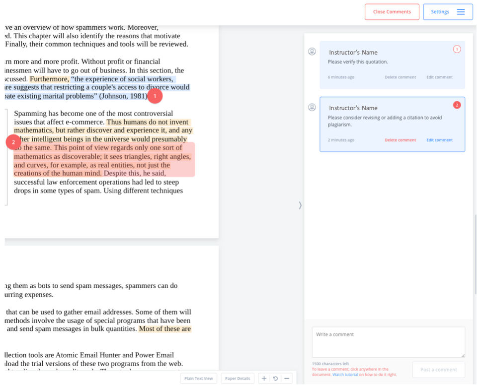 This plagiarism checker does not reliably catch plagiarism. There are whole websites (CourseHero, for instance) that are left out of the report. It is more effective for me to use a Google search than to rely on Unicheck. It does occasionally find some instances of plagiarism, but it can't be relied upon for that purpose like some others can. It also doesn't have any feedback features that allow educators to respond to the work they're seeing.