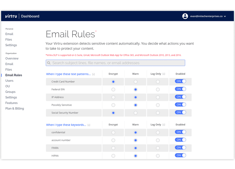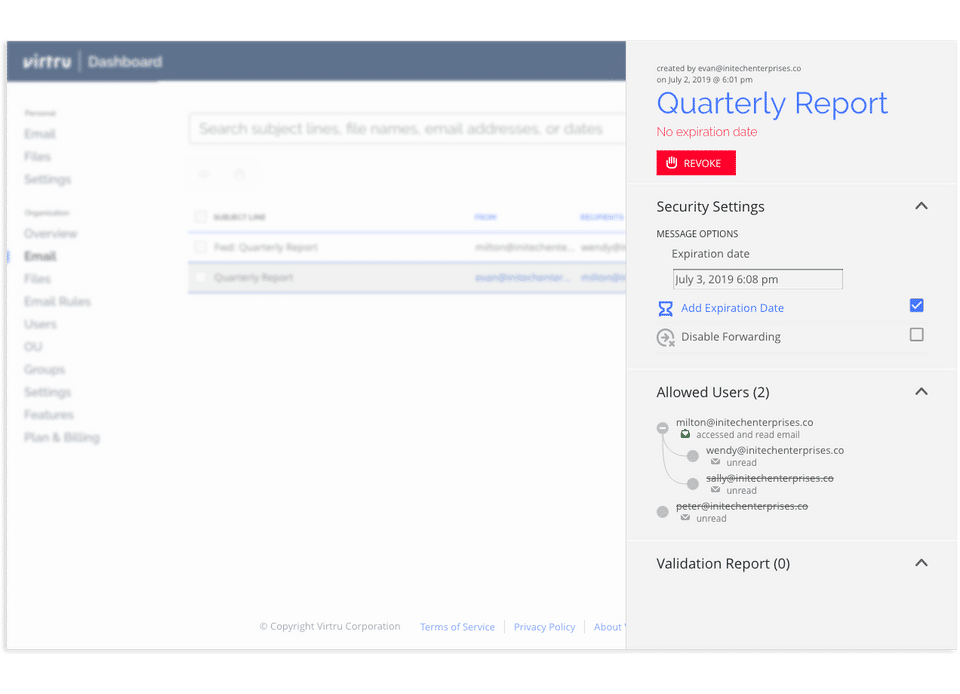 We came from a traditional secure email service and Virtru's passwordless access via Gmail is very nice.