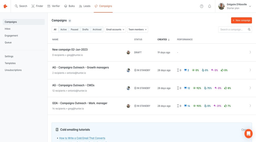 Hunter is an email finding tool that most professionals and businessmen use to quickly get verified email addresses from their sales outreach, lead generation, and networking. You can look up email addresses for free with Hunter and verify them for better deliverability. It has an easy interface and an extremely powerful built-in search, which ideally suits any level of user.