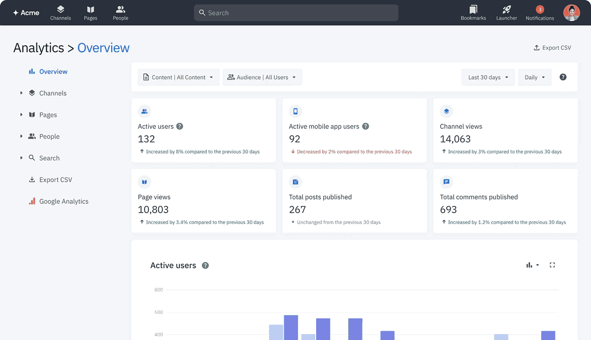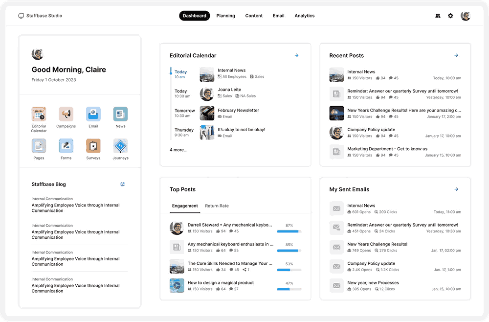 Administrators and communication leaders use data-driven insights beyond anecdotal feedback and make strategic improvements in the intranet software. Dashboards now offers real-time calculations such as page views, search trends, login history and content gaps-which provide visibility into how employee interacts with the platform. By analyzing the user segments - for example, departments, location or role, teams can highlight hidden needs and refine their employee intranet software architecture. Date-driven decision-making helps to justify ROIs, prioritize content curation and tailor communication strategies-important for any company intranet software that aims to provide measurable impact.